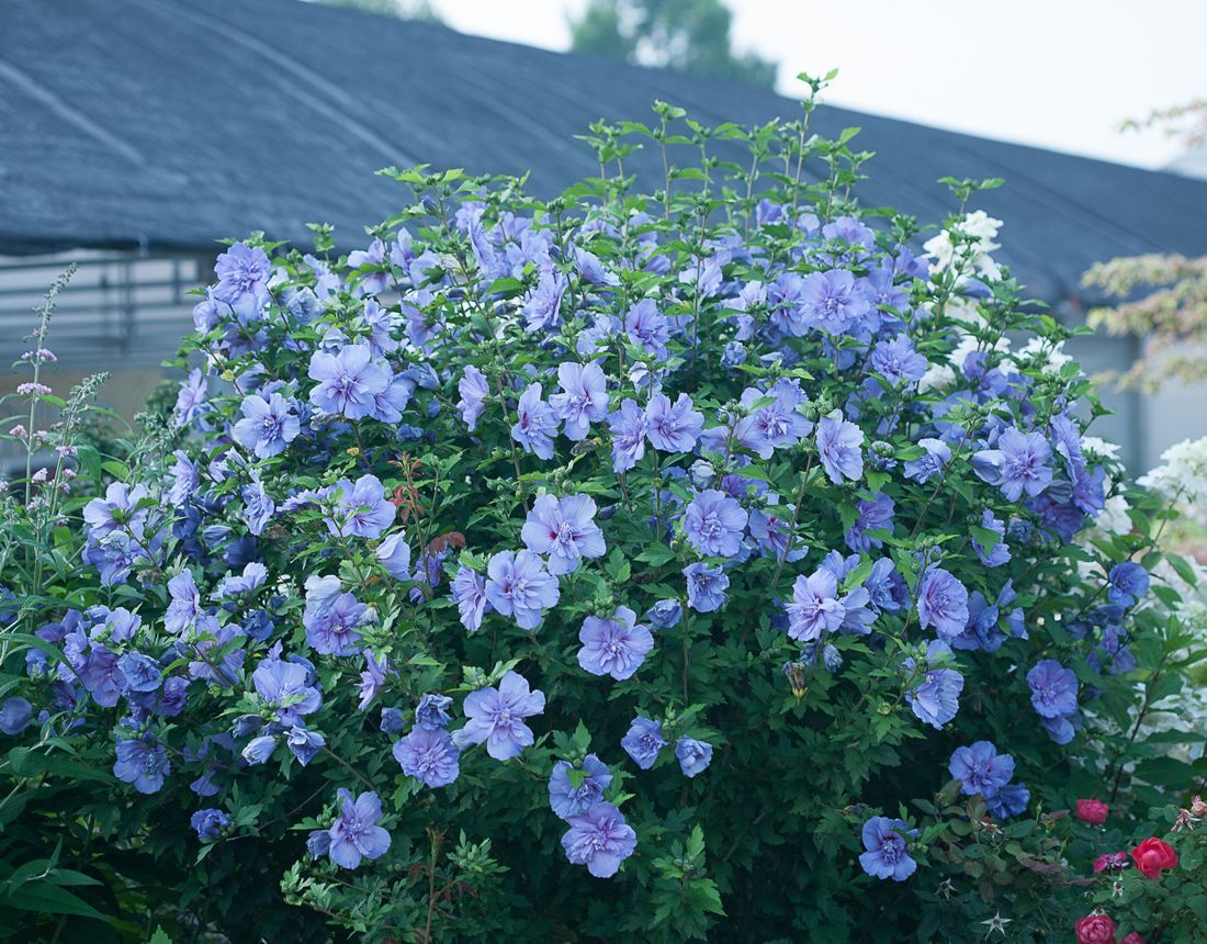 Rose of Sharon shrubs come in several sizes, though most are quite large. Chiffon varieties grow 8-12’ tall and tend to be taller than they are wide. This makes them a good candidate for screening, hedging, or planting along a tall, blank wall where you could use a pop of color. The sunny side of your garage is the perfect place for a rose of Sharon since it can handle the reflected heat, light, and soil that tends to be a bit drier. Hardy in zones 5-9.