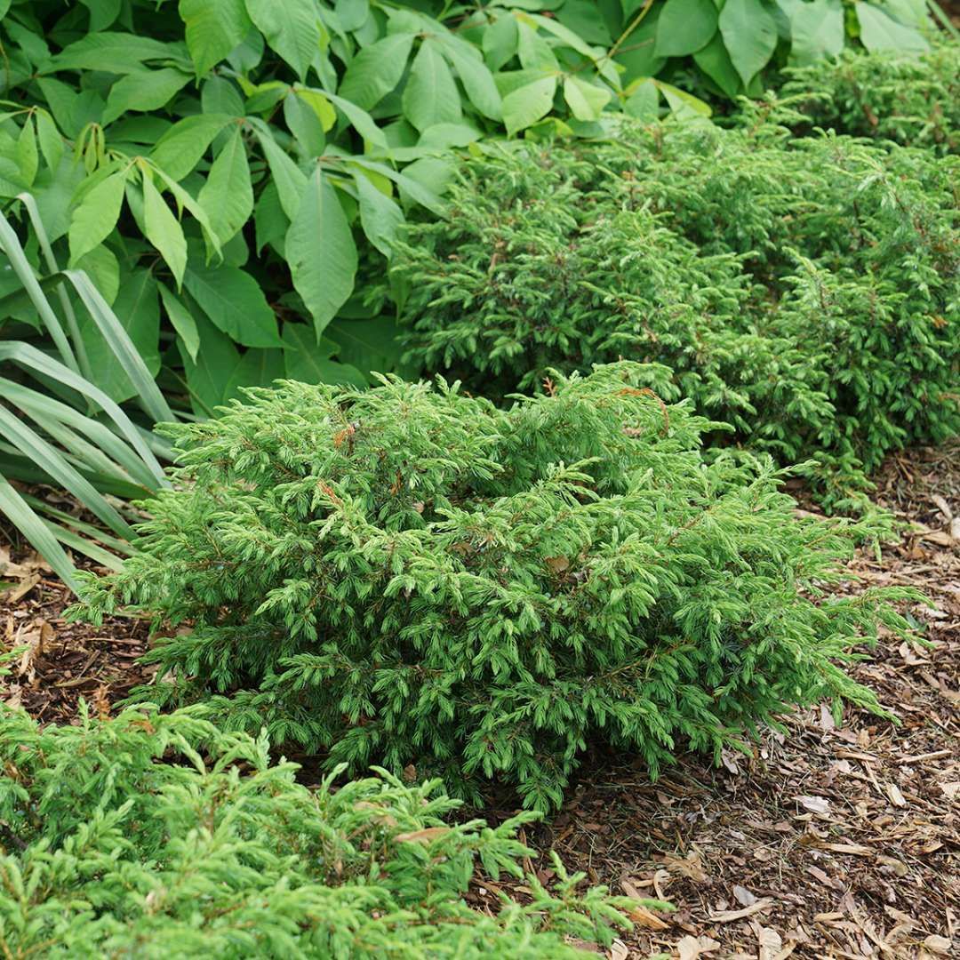 If low growing evergreens are what you need for under your front windowsills or a hedge bordering your entryway, consider this dwarf globe arborvitae. It’s easy to grow in full sun to part sun, handles sandy or well-drained clay soil, and needs little to no pruning to keep its tidy shape. If boxwood blight is an issue in your area, Tater Tot makes an excellent evergreen substitute. This ball-shaped evergreen shrub grows 1-2’ tall and wide, so it fits well in the middle layer of a foundation bed with shorter flowers planted in front and taller flowering shrubs like Limelight Prime® panicle hydrangea planted in back. Hardy in zones 3-7.