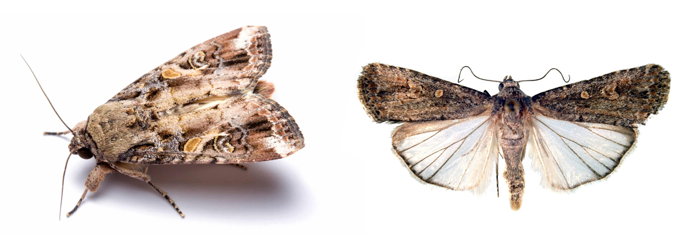 Moths: Fall armyworm moths are identified by their mottled gray forewings with a white spot near the tip and center—which is more prominent in males—and white hindwings. They are relatively small, with a wingspan of about 1 to 1.5 inches.