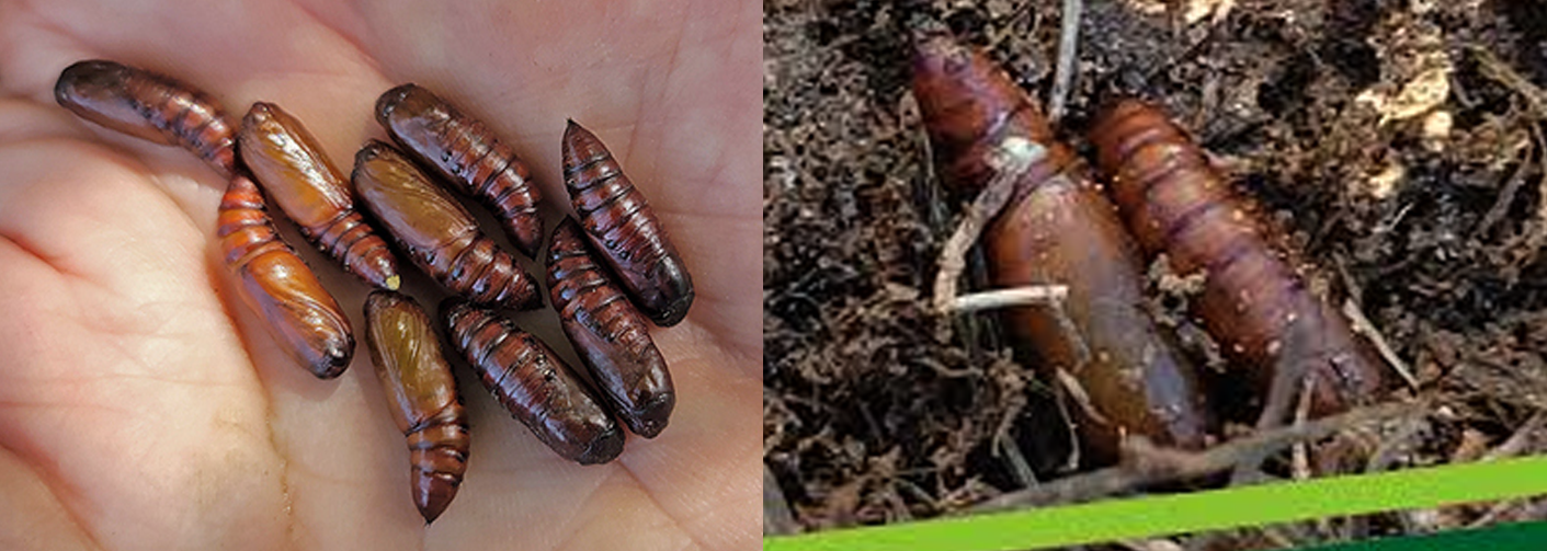 Pupae: After the larvae feed on your lawn for 2-3 weeks, they dig into the soil and pupate, typically about an inch deep. Armyworm pupae are typically .5–.75" long and are reddish-brown in color. The pupal stage lasts about 8 to 9 days in the summer. Within two weeks, a new population of moths emerges. At the moth stage, they are not a threat to your lawn.