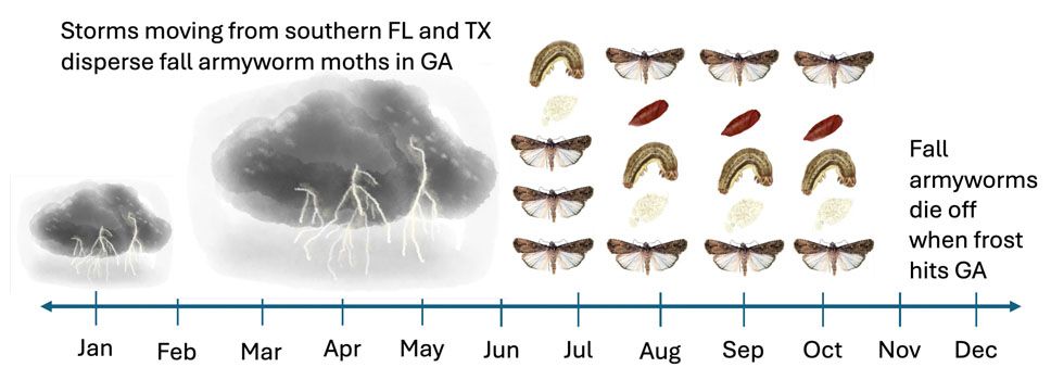 Spodoptera frugiperda. They plague many crops, but prefer most grasses, including coastal bermudagrass, fescue, ryegrass, bluegrass, Johnsongrass, timothy, corn, sorghum, and Sudangrass—even small grain crops are subject to infestation. Armyworms don’t care for Zoysia. In hot, dry weather, the moths and caterpillars really like lawns in the southeast, including Georgia, and can be found as far north as North Carolina and Tennessee. They are a subtropical moth that migrates north from the Gulf Coast and tropics, and are not indigenous to our area and cannot overwinter here. Their arrival in Georgia occurs in the spring or early summer, and are noticeable in turfgrass in early July. The exact timing of their arrival in Georgia is subject to weather conditions and varies every year, so it's important to be on alert for fall armyworm activity from July until the first frost.