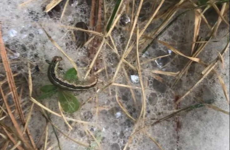 If your grass has become discolored, looks like it has been exposed to frost, or looks like it is dying, you could have an armyworm infestation. (See examples of fall armyworm damage on the right.) The damage to your turfgrass often appears in a side-to-side pattern, beginning on one side of your lawn and then quickly moves across to the other side. This happens because the larvae hatch on one side of your lawn and then "march" like an army across your lawn, eating your turfgrass. In other cases, armyworms can infest your lawn and the damage is not uniform. If you can't easily see the armyworm larvae (caterpillars) in your turfgrass, it's best to do a soap flush test to see if there's an infestation. Read how, below.
